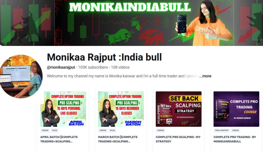She is a Trader | Content Creator | Educator, focusing on stock market education and live market insights through her YouTube channel “Monikaa Rajput : India bull and Instagram “monikaindiabull”